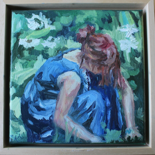 Tuinieren. Olieverf op doek incl blank houten baklijst en ophang systeem. 20 bij 20 cm.