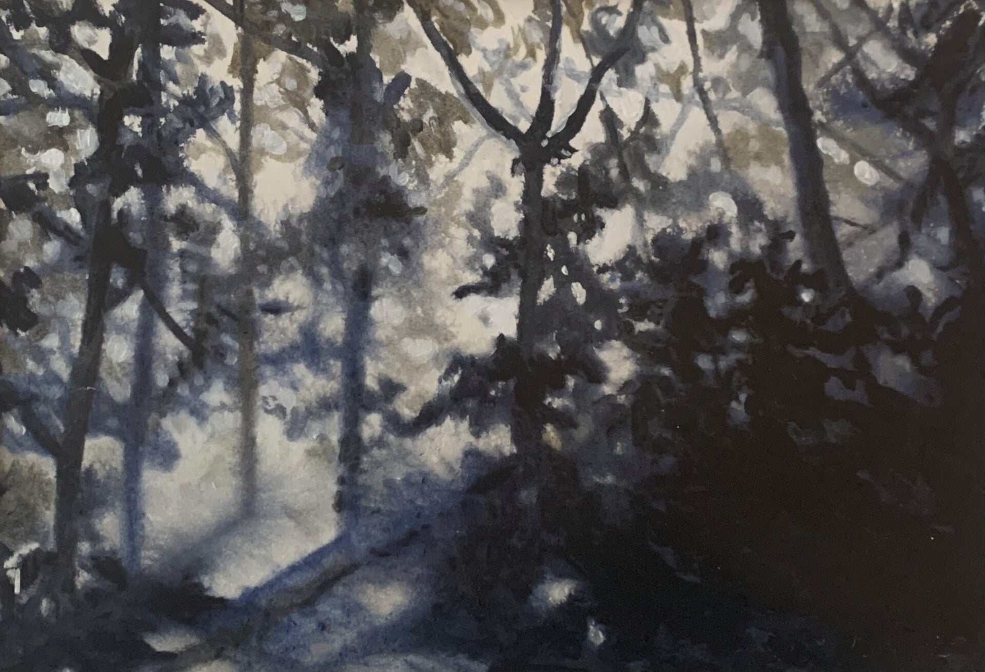 Maanlicht tussen de bomen | acrylverf op papier